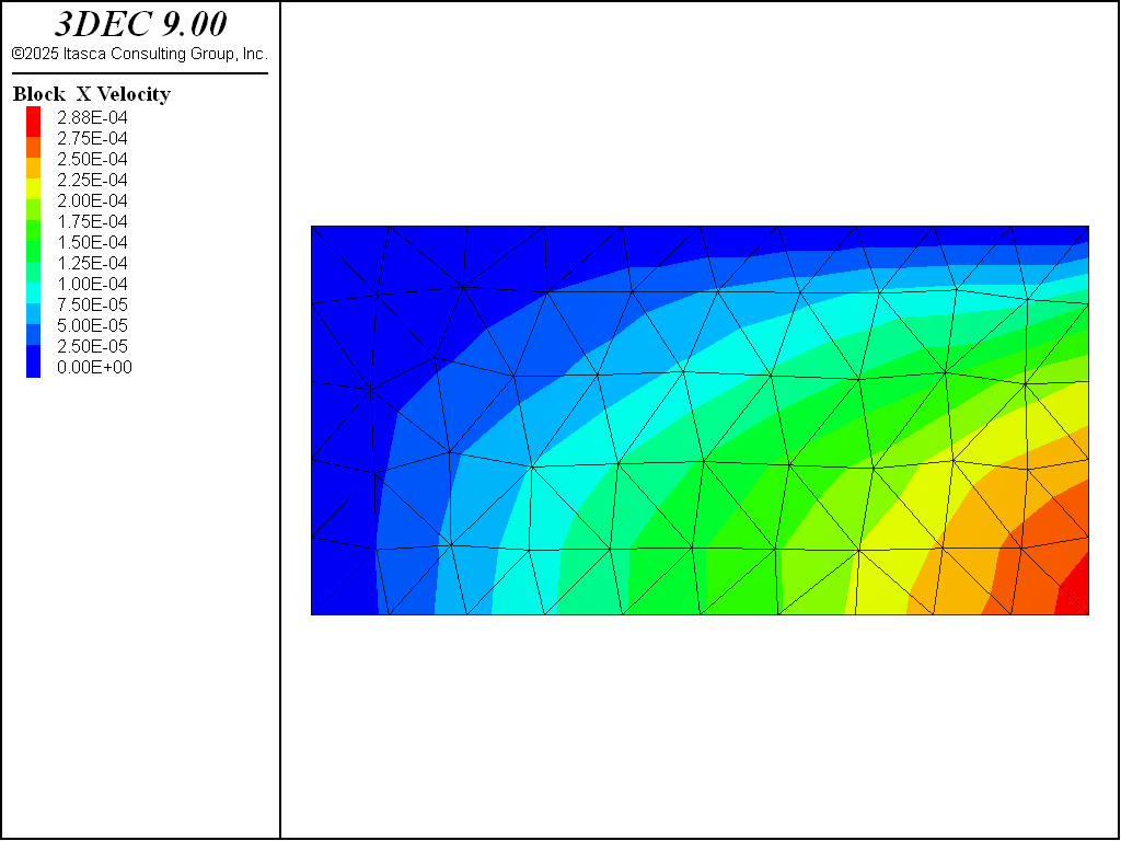 The contours of \(x\)-velocity from 3DEC are shown in Figure 1. in Figure 1.