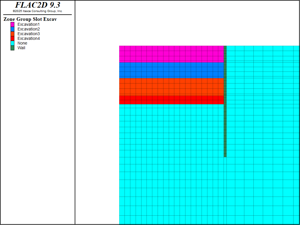 The diaphragm wall is modeled using zones (Young’s modulus = 30 GPa, Poisson’s ratio = 0.15, thickness = 0.8 m).