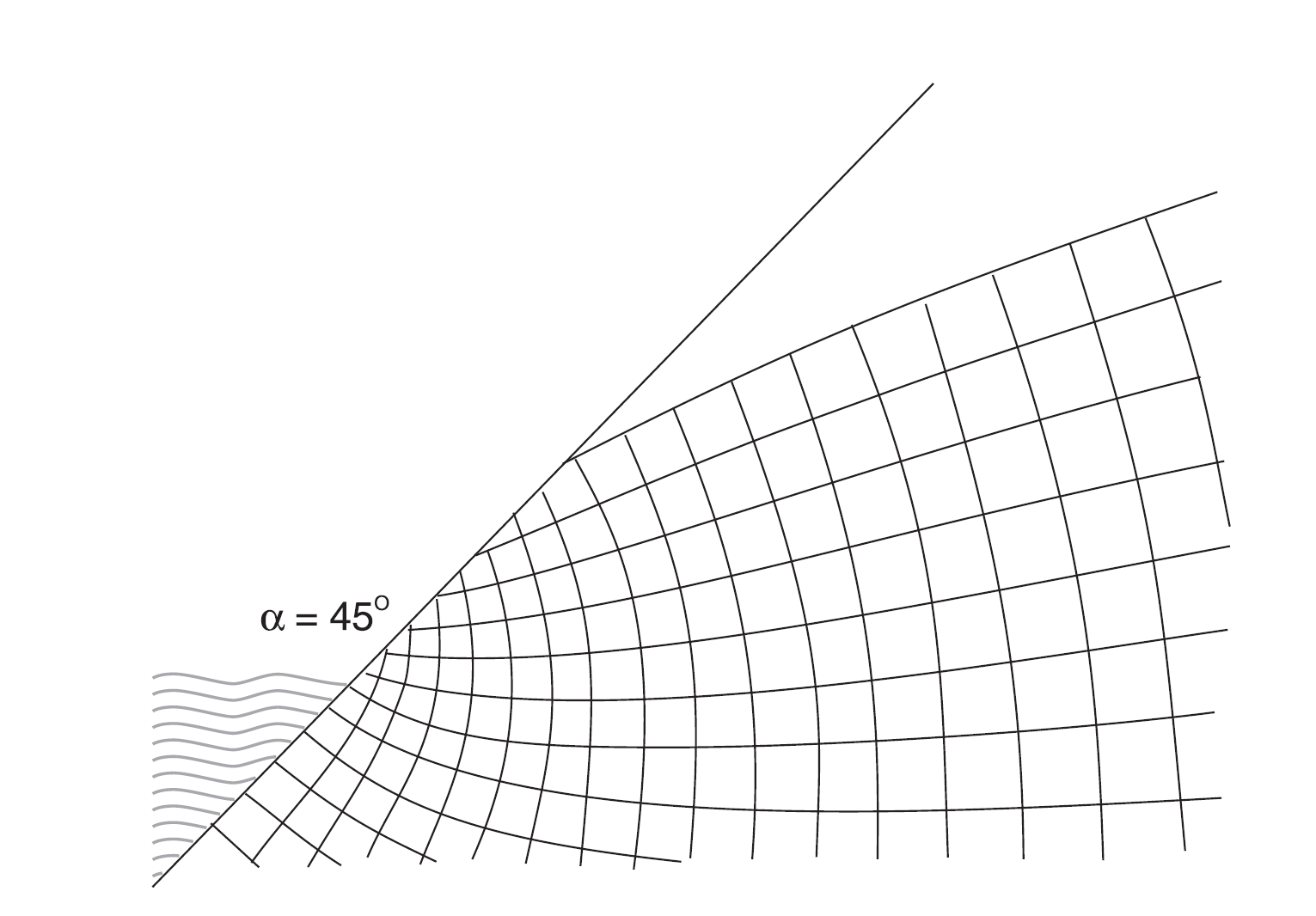 Figure 3: Flow net near the seepage face for α = 45 ◦ (Strack and Asgian 1978)