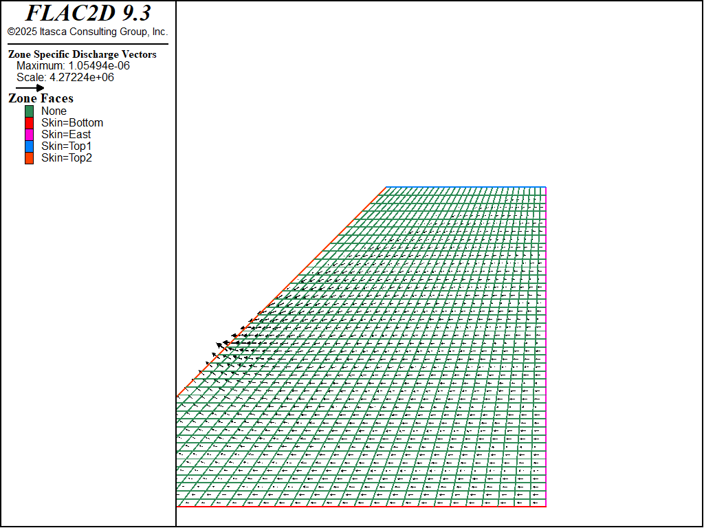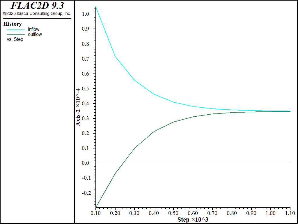 The model solve-fluid command with a value of ratio-flow equal to 5e-3 is used to cycle the model to steady state. The evolution of the model is monitored using the FISH function “flow” , which calculates inflow and outflow at the fixed pore-pressure boundaries. At steady state, the free surface is a streamline,and inflow is equal to outflow.