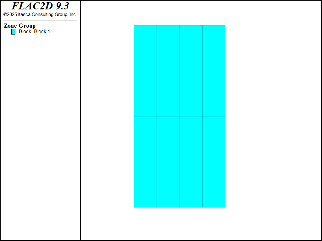 For the numerical simulation, a block with a width of 2 m and height of 4 m is selected. The domain is discretized into 8 quadrilateral zones as shown Figure 2. A uniform velocity is applied in the \(y\)-direction at both ends of the block to induce compression of the sample.