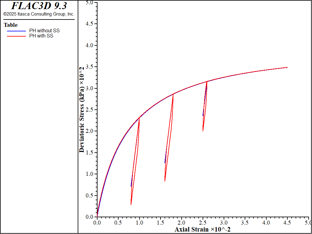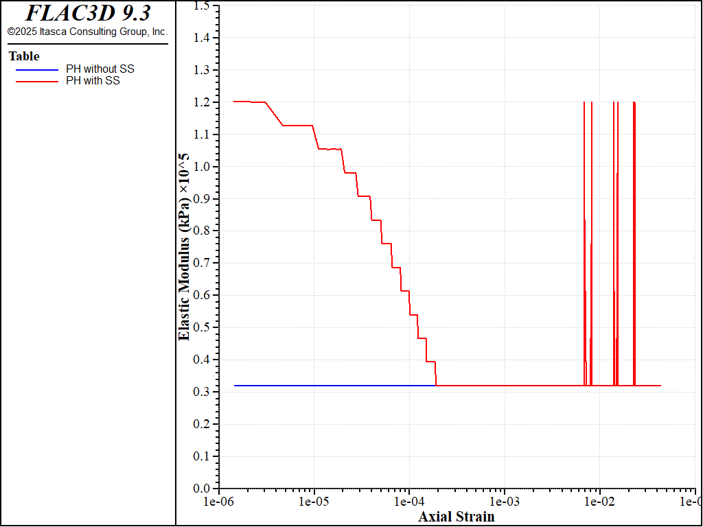 This example compares the behavior of the Plastic-Hardening (PH) model without and with small-strain stiffness during triaxial compression. Both models comprise a one-zone triaxial compression test with a constant cell pressure of 100 kPa. Case 1 is the standard PH model without small-strain stiffness, and Case 2 is the PH model with small-strain stiffness. The parameters are listed in Table 1.