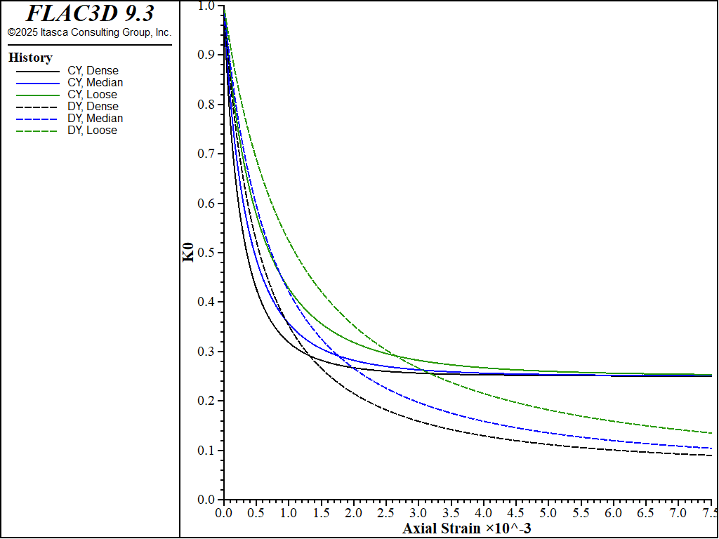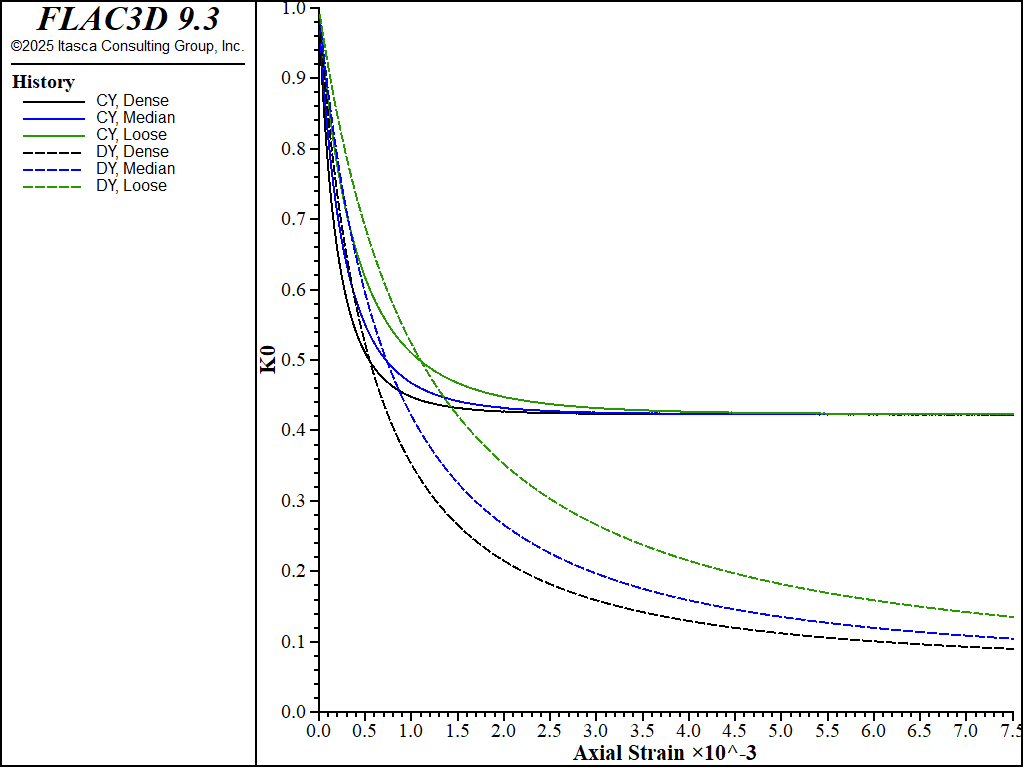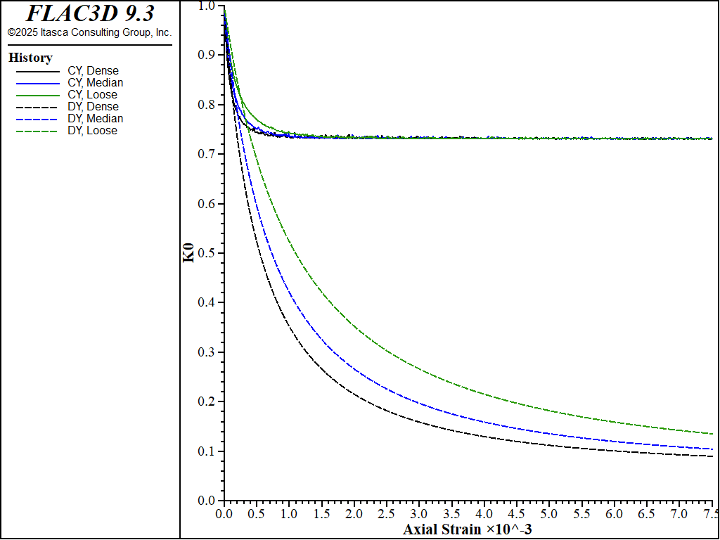 The results of the oedometer simulations show that, with the given properties, a higher value of \(K_0\) is achieved for the CYSoil model than the double-yield model. And for all tests, the lower the aspect ratio of the cap, the higher the \(K_0\) that is achieved. Also, dense, medium, and loose sands converge to the same ultimate \(K_0\) value as deformation takes place, and they do so at a faster deformation rate for the CYSoil model than the double-yield model.