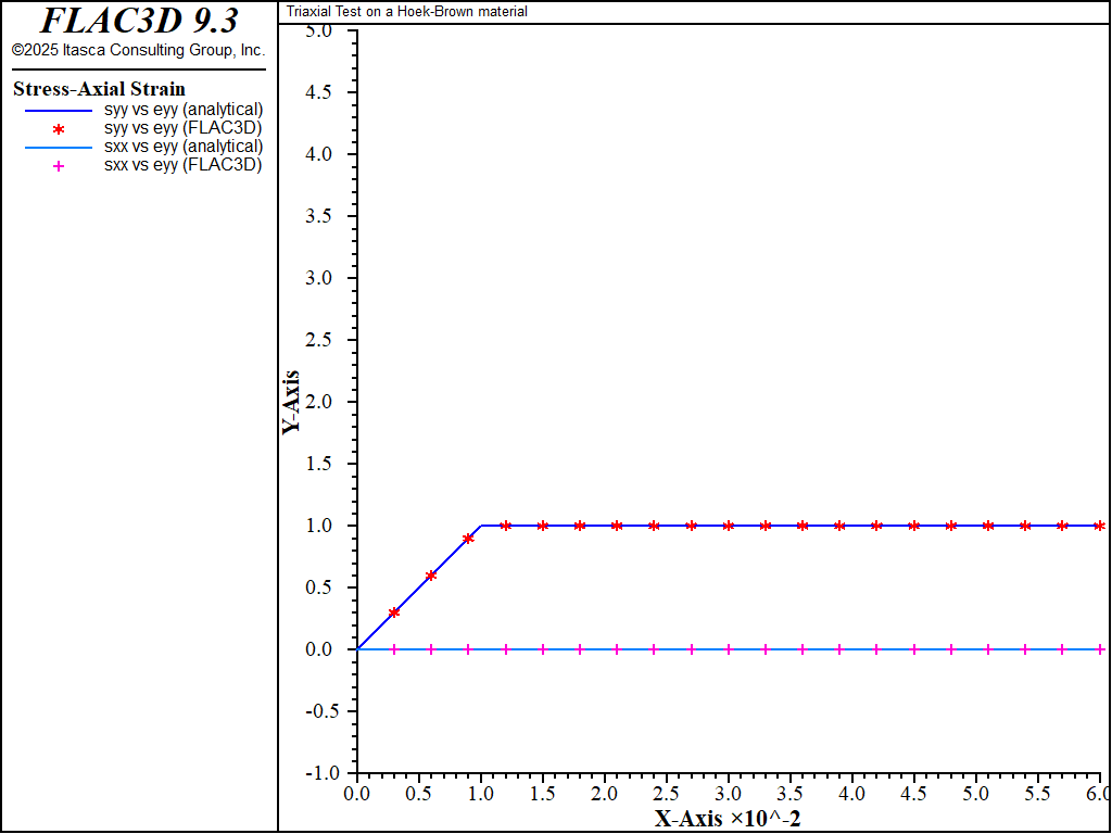 The FLAC3D results for the zero confining stress case are compared to the analytical solution (see Triaxial Compression Test with Hoek-Brown-PAC Model) in Figure 1 and Figure 2, and the results for the high confining stress case are compared in Figure 3 and Figure 4.