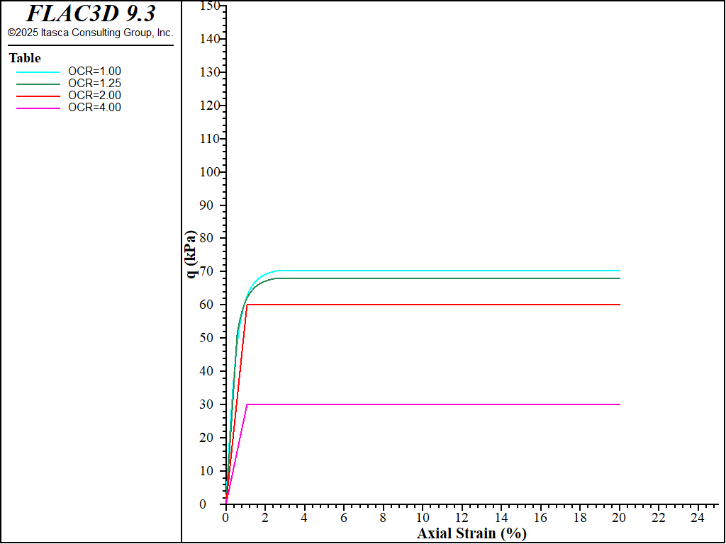 The Soft-Soil model is used to simulate the triaxial consolidated-undrained (CU) tests with the consolidated stresses at 100, 80, 50, and 25 kPa. The pre-consolidated pressure (cap pressure) is assumed 100 kPa for all four cases, which corresponds to OCR = 1.00, 1.25, 2.00, and 4.00, respectively. The triaxial undrained compression is realized by setting zero volumetric strain, or the horizontal strains are setting to -0.5 times of the axial strain. The axial strain is up to 20%. The input parameters are summarized in the table: