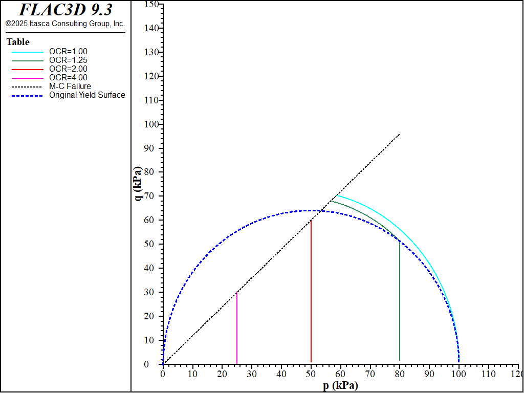 From Figure 2, for the case of OCR = 1, p is decreasing immediately after the undrained triaxial loading until it hits the Mohr-Coulomb shear failure line and the cap is expanding when q is increasing. For the case of OCR = 1.25, p remains constant until it reaches the cap; then p decreases until it reaches the Mohr-Coulomb shear failure line. For the cases of OCR = 2 and 4, p remains constant because the load paths reach the Mohr-Coulomb shear failure line before the cap. For the last two cases, the high OCR values prevent the undrained loading paths from reaching the cap.