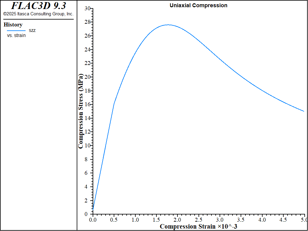 The first test is the uniaxial compression loading. the numerical result is shown in Figure 1. The numerical model correctly duplicated the whole loading, which can be verified by the elastic slope (Young’s modulus), initial and peak compression yield stress.