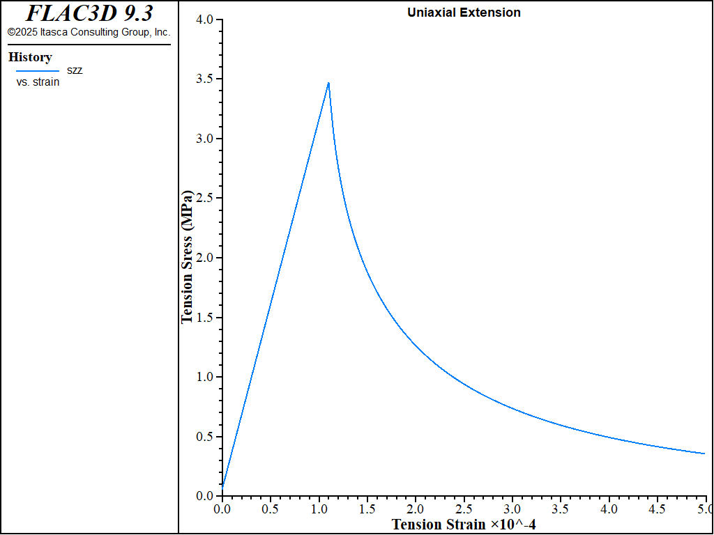 The second test is the uniaxial tension loading. the numerical result is shown in Figure 2. Since \(f_t^0=f_t^m\), the uniaxial tension stress vs train curve has immediate softening, which has been correctly simulated by the numerical model the whole loading.