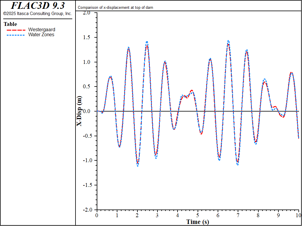 These results illustrate the effect on displacement of the hydrodynamic pressures. The case using the Westergaard adjustment is in good agreement with the case modeling the water explicitly.