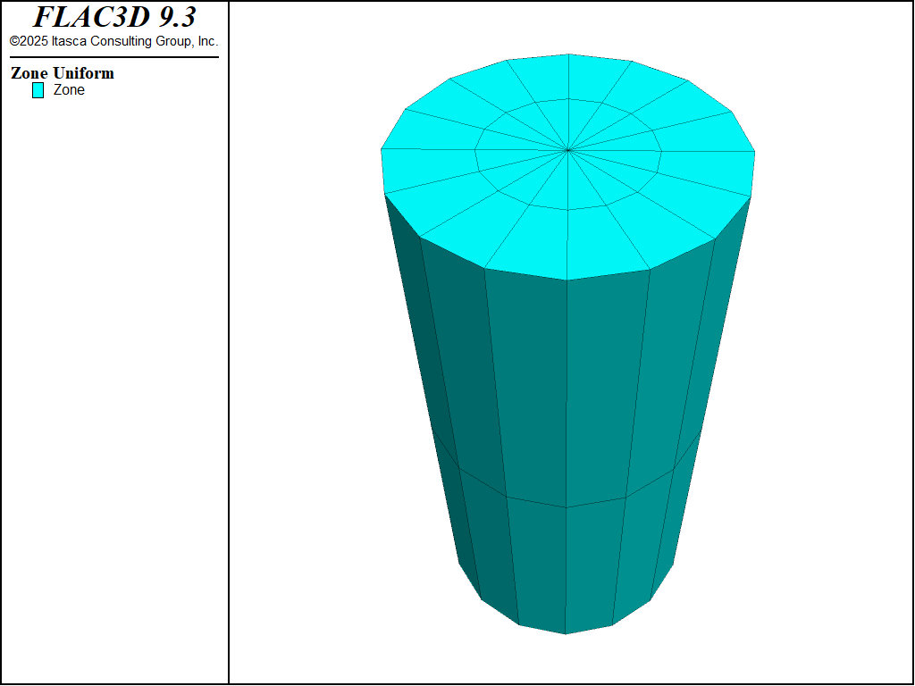 For the numerical simulation, a cylinder with a radius of 1 m and height of 4 m is selected. A system of reference axes with the \(x\)- and \(z\)-axes located in the base of the cylinder and the \(y\)-axis pointing along the cylinder axis is selected. This domain is discretized into 48 zones organized in a radial pattern (see Figure 2). A uniform velocity is applied in the \(y\)-direction at both ends of the cylinder to induce compression of the sample.