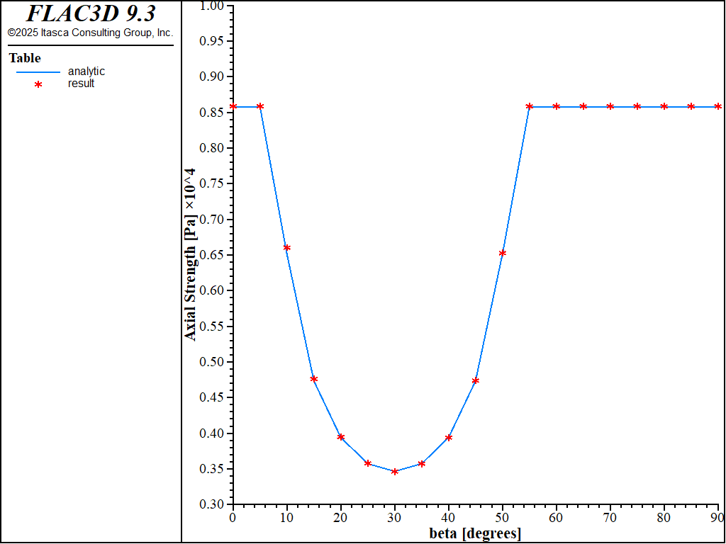Figure 3 compares results of the FLAC3D runs with the analytical compressive strength predictions. The match is satisfactory, with a relative error smaller than 2% for all values of \(\beta\).