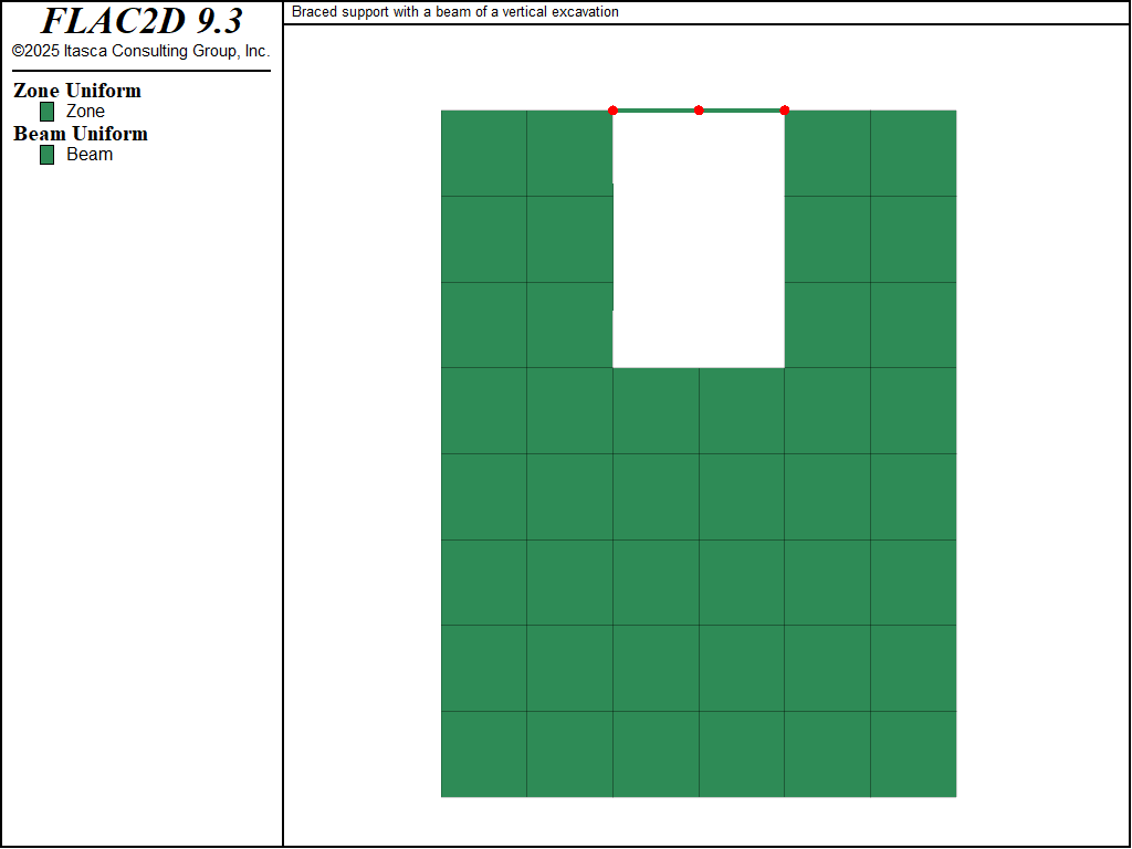 This example examines a trench that is supported with one strut bracing the excavation walls at the top. The following command sequence is for the simple case in which the brace is placed immediately upon excavation. The strut is represented as a single beam composed of two elements, and is created using the structure beam create by-line command. Use of this command ensures that the two ends of the beam are attached to the grid such that the translational degrees-of-freedom are rigidly connected and the rotational degrees-of-freedom are free.
