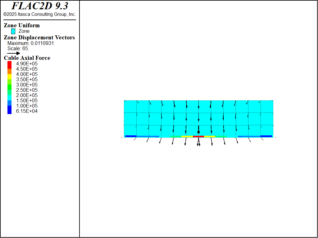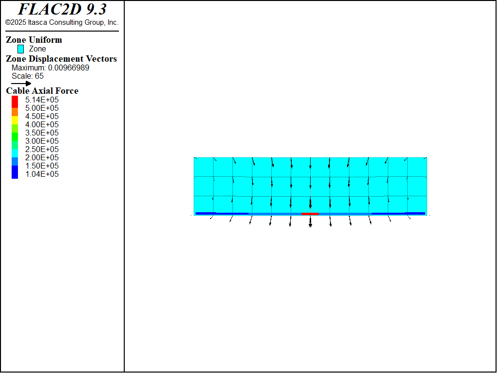 In the previous model, the grout cohesive strength was set to a very large value to prevent grout failure. If we set the grout cohesive strength equal to 1.5 × 105 N/m and rerun the model, we find that the system still stabilizes; however, during the loading process, the grout yields (cable slips) in the middle region (see Figure 4). The grout stress in this region is equal to the grout cohesive strength (see Figure 5), the tensile force is distributed farther along the cable (compare Figure 2 and Figure 6), and the maximum vertical centerline displacement has increased from 9.66 mm to 11.1 mm.
