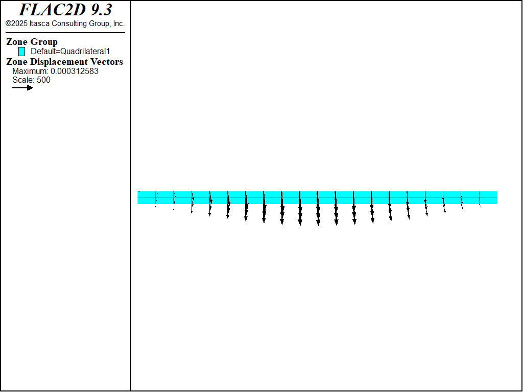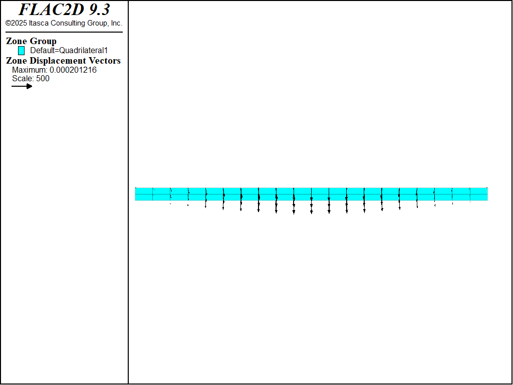 A simply supported wooden beam (\(E\) = 8.6 GPa, \(\nu\) = 0, length of 2.5 m, height of 90 mm) has a concentrated load of 2000 N applied at its center. The beam is modeled with 40 FLAC2D zones. (Note that more zones are required to obtain the correct beam-theory solution. The system, as modeled, is too stiff; however, it is sufficient for the present example.) The FLAC2D model and the displacement field are shown in Figure 1.