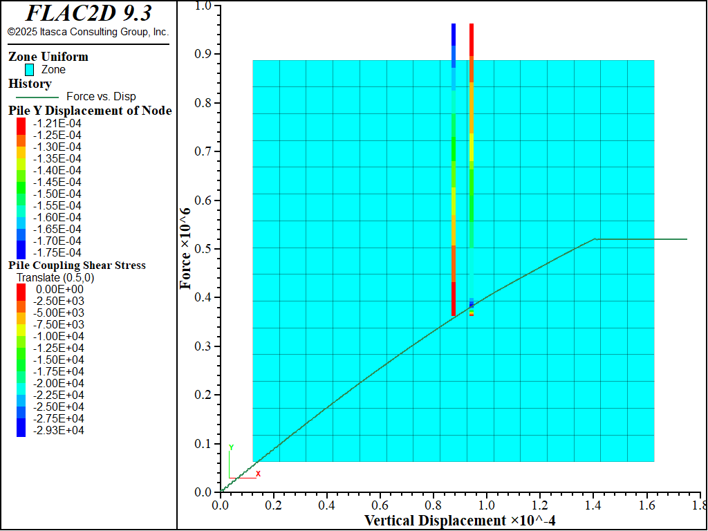 To illustrate the effect of end-bearing capacity, we first consider the case corresponding to a friction pile in sand (see the data file at the end of the example). The pile and grid geometries are similar to those in the Skin Friction example. Here the property \(c_s\) is set to zero and the pile friction (\(\phi_s\)) to 10 \(^{\circ}\), so that the pile shear strength is generated by confining pressure according to the shear behavior of the pile-grid boundary. A downward velocity is applied at the pile top, and the top force and vertical displacement are monitored for a total of 20,000 steps.