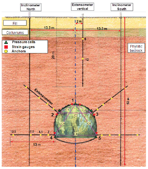 The instrumentation is composed of two inclinometers on both sides of the tunnel, one vertical extensometer on the tunnel axis, and three target prisms. In addition, four radial extensometers, six vibrating wire strain gauges on the steel rib, five pressure cells, and convergence targets were installed from inside the tunnel. This tunnel was excavated using the so-called “ADECO-RS” method (Lunardi 2008). This method emphasizes the significance of controlling the deformation response of the ground in the core ahead of the tunnel face to the tunnel stability and surface settlement.