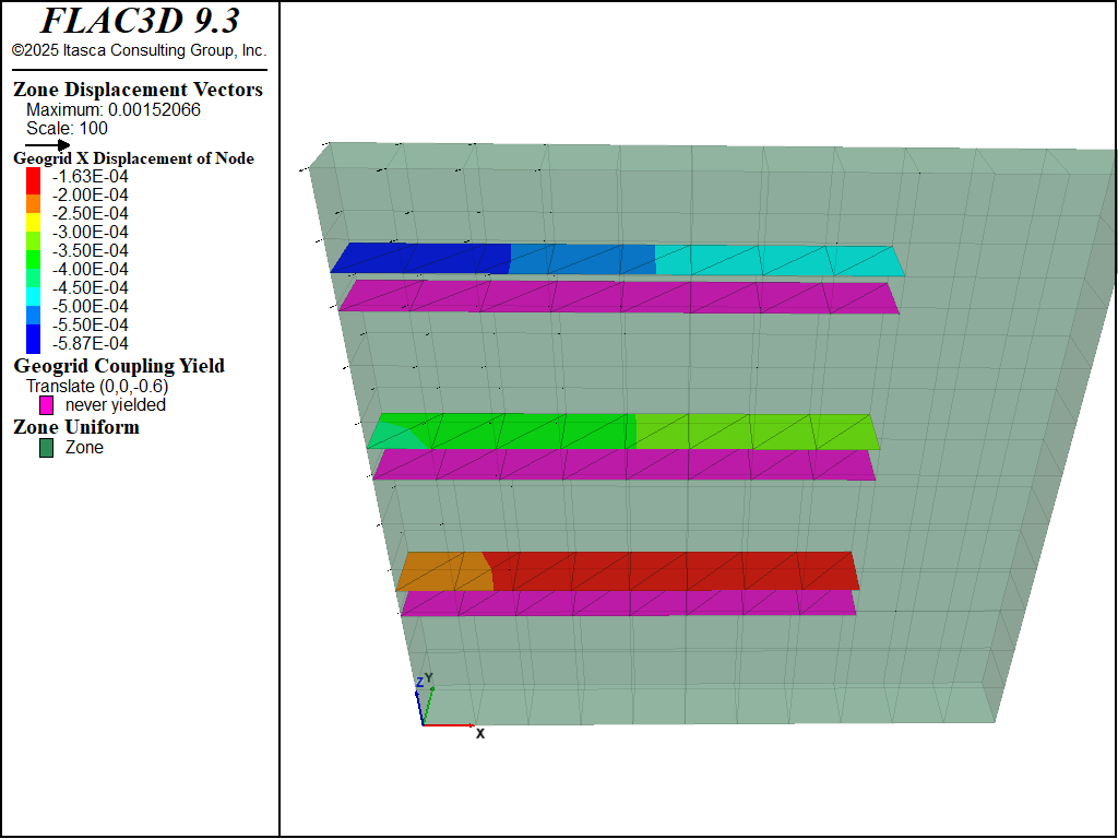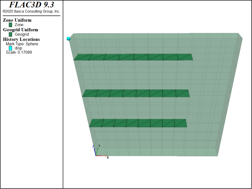 The FLAC3D model consists of 48 geogrid elements and 121 zones, as shown in Figure 1. The model simulates a one-meter wide section of soil subjected to plane-strain conditions (no out-of-plane motion). During the construction of the actual embankment, the soil would have been added gradually with each geogrid layer being emplaced and then covered with soil. Instead, simply emplace all three geogrid layers into a stress-free soil, and then install the soil in-situ stresses that correspond with the soil weight. At this stage, each geogrid layer is subjected to a different confining stress that increases with depth. The embankment is now created by removing the constraint on the left side of the model and cycle until either equilibrium is reestablished or it becomes clear that the embankment is collapsing.
