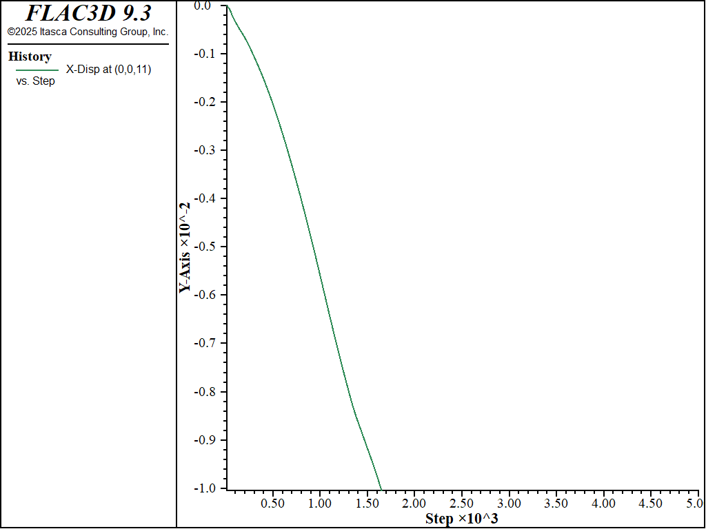 For a geogrid-soil interface friction angle of 0 degrees, the shear resistance of the geogrid is not mobilized, and the soil itself does not have sufficient strength to prevent the collapse of the embankment. Figure 2 shows that the geogrids are carrying no load, and that the slip condition has been reached at all geogrid nodes. A plot of the \(x\)-displacement of the top-left gridpoint (see Figure 3) indicates that the embankment is collapsing.