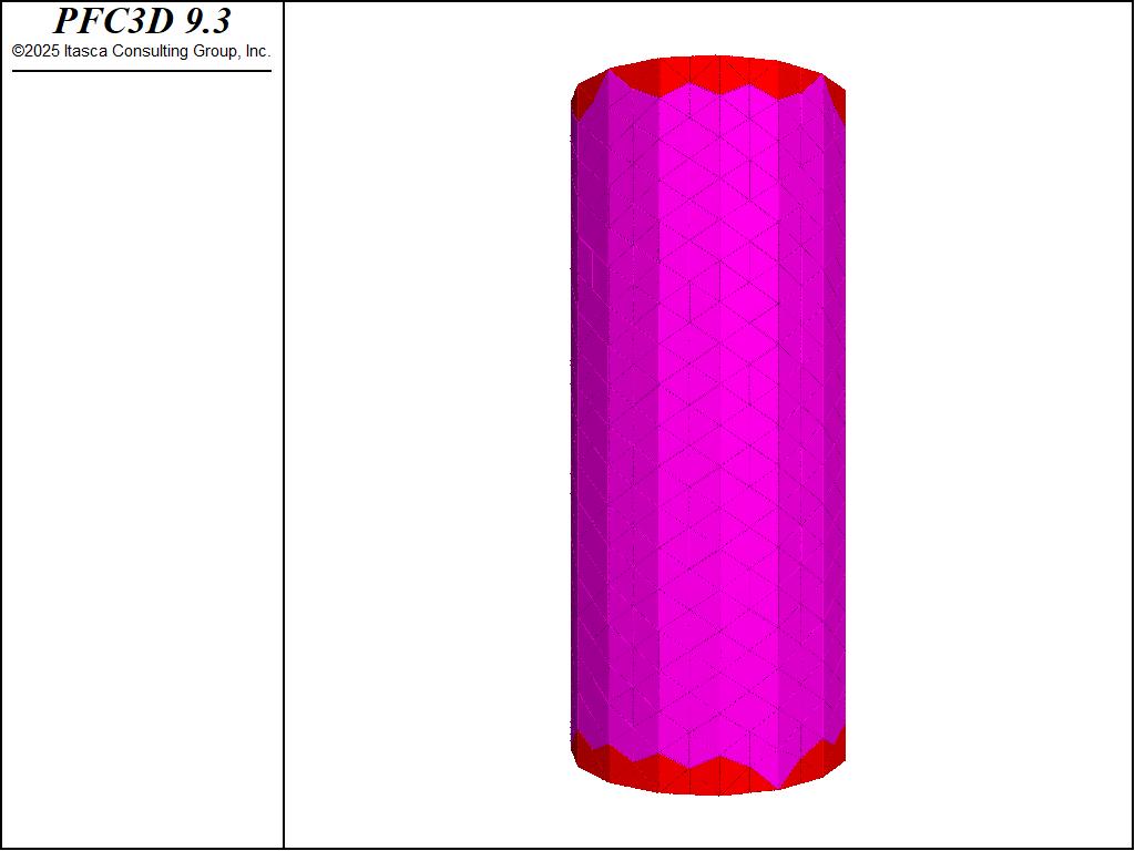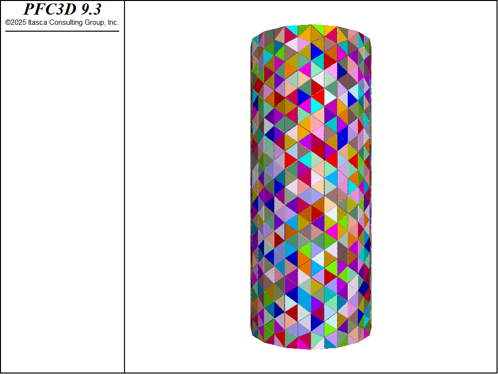 This example shows how to effectively use rigid blocks for simple Bonded-Block Modeling (BBM). The specimen created is shown below. This specimen is created using the rblock construct command. This command takes a geometry set and meshes it, creating a zero porosity packing of rigid blocks. The rigid blocks are then scaled so that they initially overlap. This is important for BBM modeling as, when rigid blocks are bonded, the computed contact location is only incrementally updated. In other words, the contact location does not