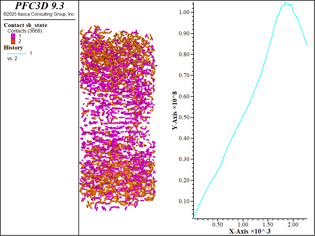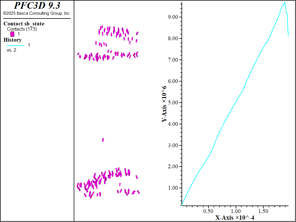 The figures below demonstrate the UCS results run so that the residual strength is 80% of the peak. The desired peak value is achieved and the computed fragments show thorough failure of the specimen with both tensile and shear failures.