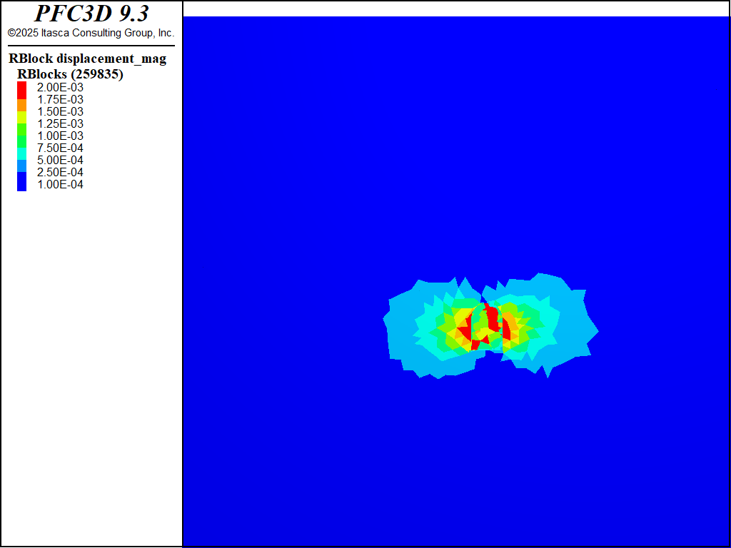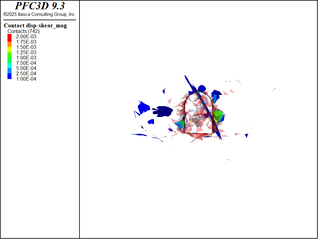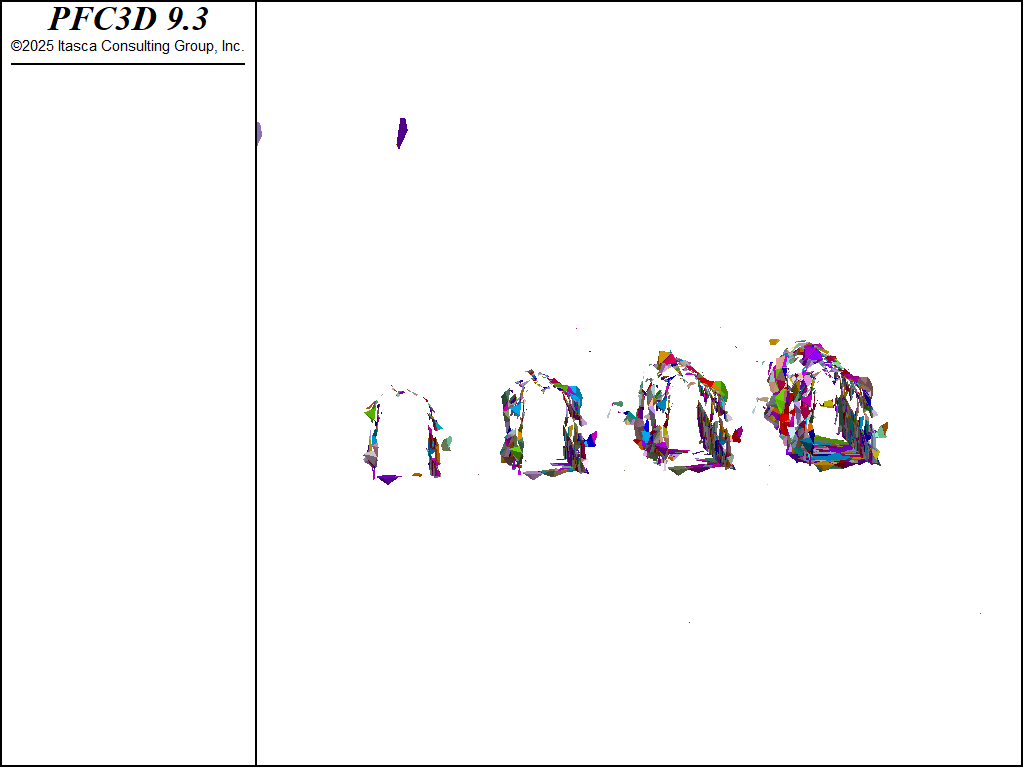 After the preceding steps the environment is enhanced to track cracks in the bulk material and to apply support stresses. The former is accomplished by catching the \(bond_broken\) event for the subpringnetwork model. The \(bond_break\) event triggers when a subcontact is broken, whereas the \(broken\) event triggers when all three subcontacts are broken. Fractures are created for each contact when it is completely broken in different DFNs so that one can visualize the progression of failure. The support stresses are applied with the rblock facet apply command. At each cycle the out-of-balance force and moment are applied to the identified rigid blocks. A simple FISH function is called for each rigid block to compute a multiplicative factor that is applied to the out-of-balance forces/moments. The multiplicative factor is 1 for a fixed number of cycles and then linearly ramps to 0 over a fixed number of cycles for all rigid blocks with the apply condition. In addition, the magnitude of the out-of-balance force on the support blocks divided by the area of the tunnel surface, or the average applied stress, is cataloged.