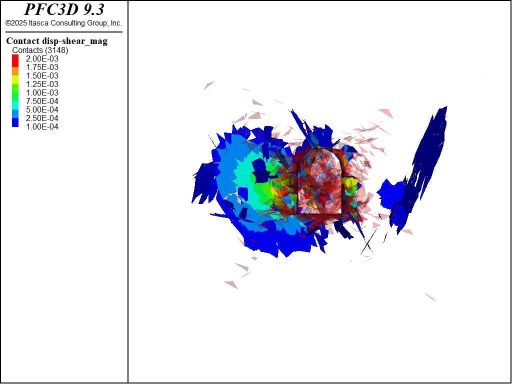 The final figures below show the progression of fracturing and slip on the faults for each stage of excavation. The maximum contour is the same as the displacement figures above. Slip is activated on a few large fractures, with some slip extending on the largest fractures to about twice the tunnel radius or more, with some limited slip on preferentially oriented fractures away from the tunnel.