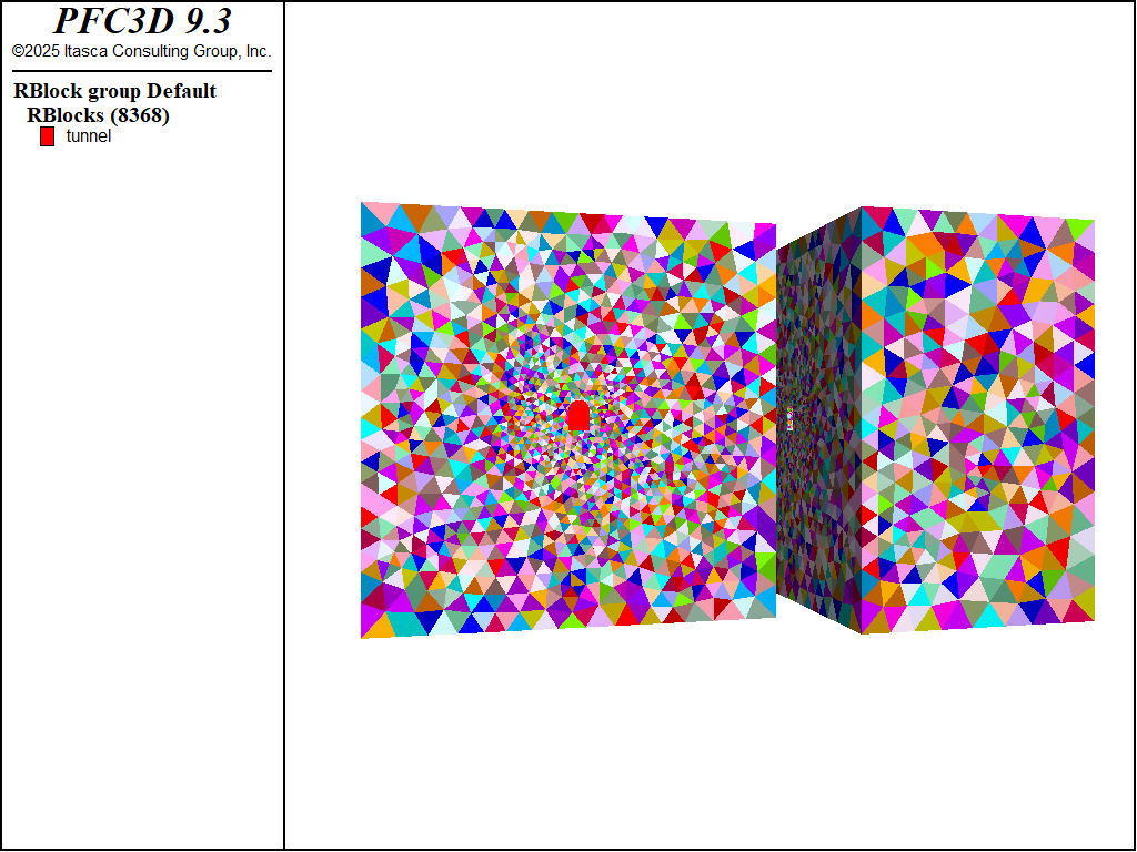 The rblock construct command is used to create rigid blocks inside a parallelepiped domain. The resulting tetrahedra form a zero-porosity representation of the rock mass, with specified maximum edge length, that conforms to the boundary of the parallelepiped. Geometry node extra variables are used to insert randomness into the resulting rigid blocks and to also grade the rigid block sizes as a function of distance from the center of the tunnel. Subsequent to model creation, the boundaries are identified for future reference, prior to block scaling to ensure initial overlap.