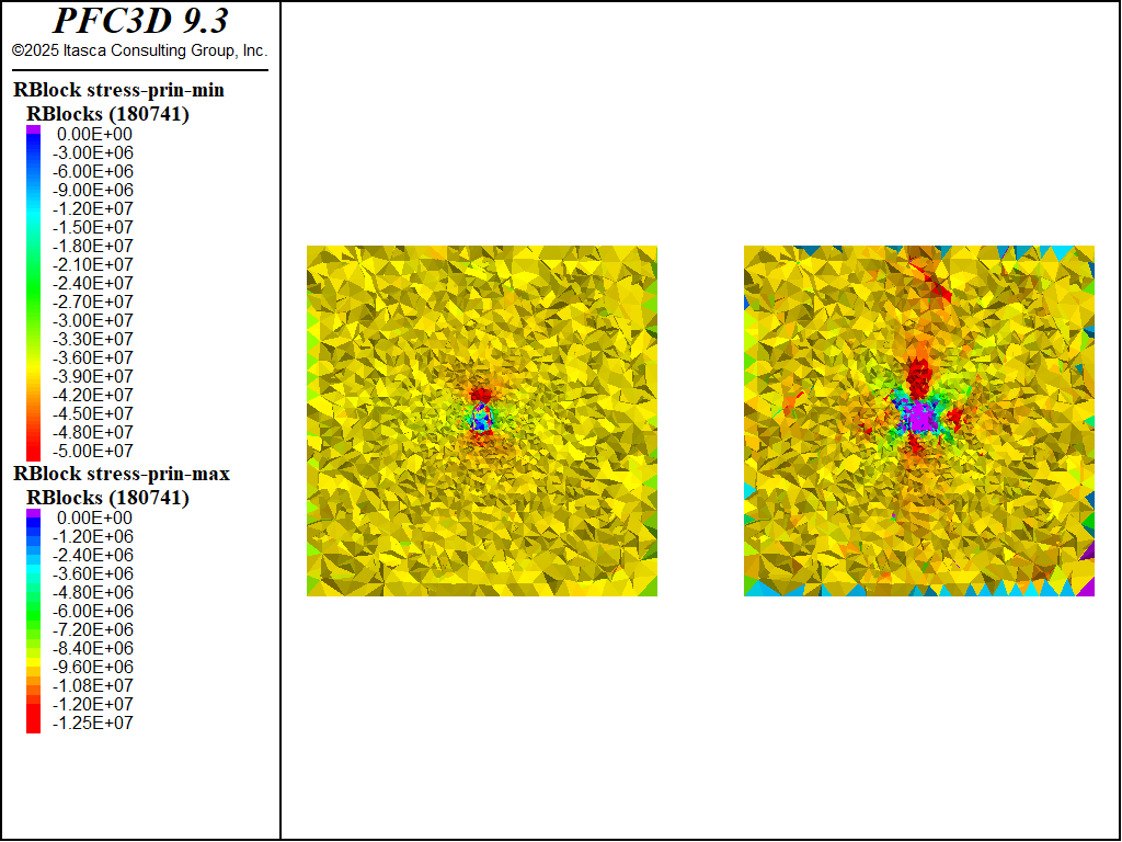 For each of the four excavation stages a unique DFN is created, the tunnel blocks are deleted for that stage, the support blocks are identified for that stage, the \(rblist\) FISH list used to compute the \(appliedStress\) is updated, the tunnel surface area is updated, the old apply conditions are removed (if any), the new apply conditions are installed and the model is solved. Subsequent to solving for each stage fragments are computed and assigned to unique group slots, allowing one to visualize the progression of the fragmentation as well.