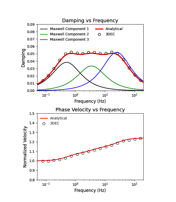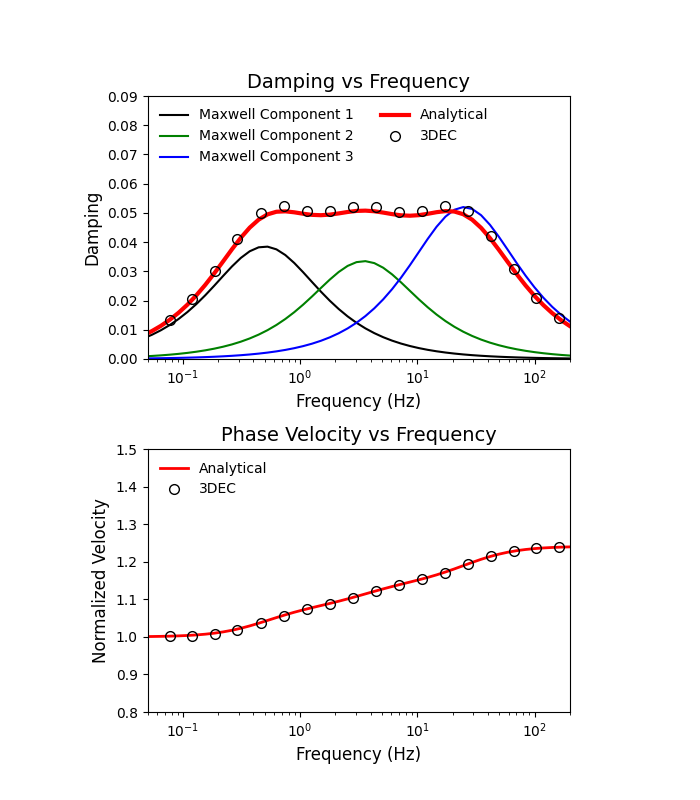 This verification problem considers a 100-m long column. Horizontal velocities are initialized with a sine wave. Several tests are run with different stiffness properties to simulate different frequencies of vibration. Maxwell damping is applied and the damping versus frequency is compared to the analytical solution.
