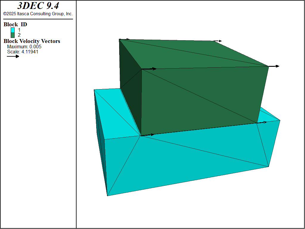 First, a normal stress of 20 MPa — which is representative of the confining stress acting on the joint — is applied. A horizontal velocity is then applied to the top block to produce a shear displacement that is also representative of the displacements expected in the problem application. For demonstration purposes, we only apply a small shear displacement of less than 1 mm to this model.