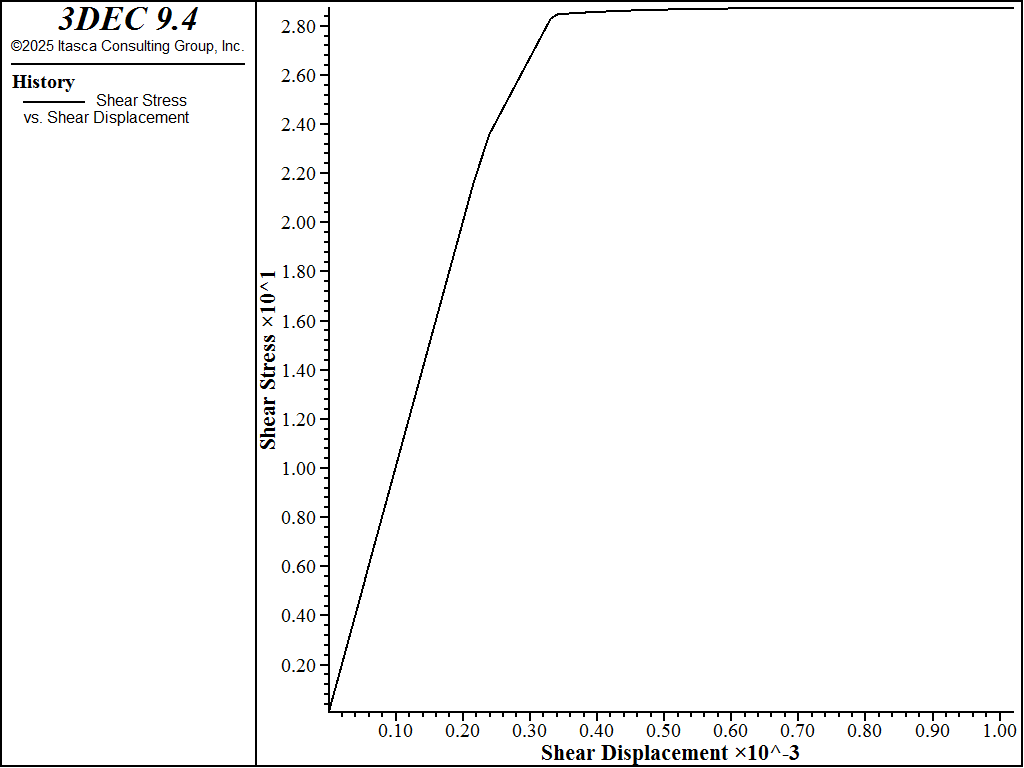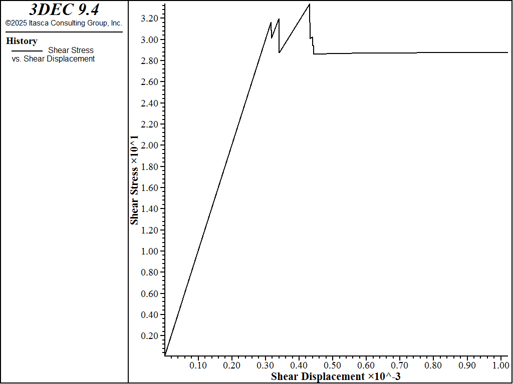 Figure 1: 3DEC Mohr-Coulomb joint shear stress versus shear displacement behavior.
