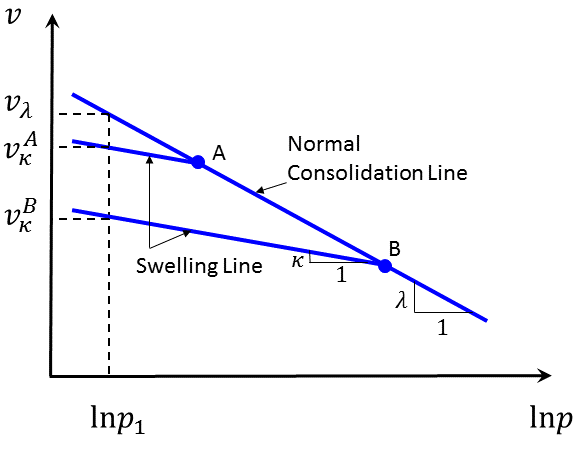 where \(\kappa\) is a material constant, and the value of \(v_{\kappa}\) for a particular line depends on the location of the point on the normal consolidation line from which unloading was performed (i.e., \(v_{\kappa}^A\) for unloading from point \(A\), and \(v_{\kappa}^B\) for unloading from point \(B\) in Figure 1).