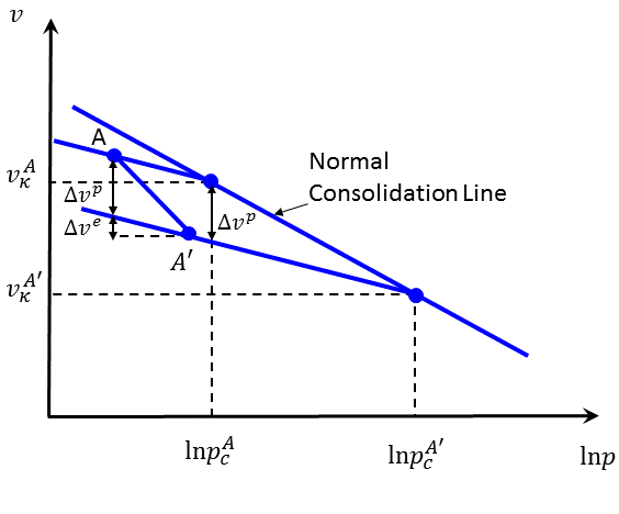 The specific volume and mean pressure at the intersection of the swelling line and normal consolidation line are referred to as (normal) consolidation (specific) volume and (normal) consolidation pressure (\(v_c^A\) and \(p_c^A\), in the case of point \(A\)). Consider an incremental change in stress bringing the point from state \(A\) to state \(A'\). At \(A'\), there is a corresponding consolidation volume, \(v_c^{A'}\), and consolidation pressure, \(p_c^{A'}\). The increment of plastic volume change, \(\Delta v^p\), is measured on the figure by the vertical distance between swelling lines (associated with points \(A\) and \(A'\)), and we can write, using incremental notation,