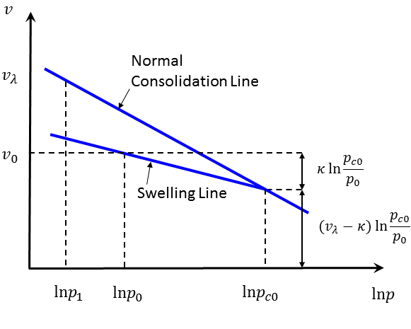 Initial values for specific volume, \(v_{0}\), and bulk modulus, \(K\) — Given an initial effective pressure \(p_0\), the initial specific volume \(v_0\) must be consistent with the choice of parameters \(\kappa, \lambda, p_1\), and \(p_{c0}\). The initial value \(v_0\) is calculated to correspond to the value of the specific volume corresponding to \(p_0\) on the swelling line through the point on the normal consolidation line at which \(p = p_{c0}\). From Figure 4, it follows that