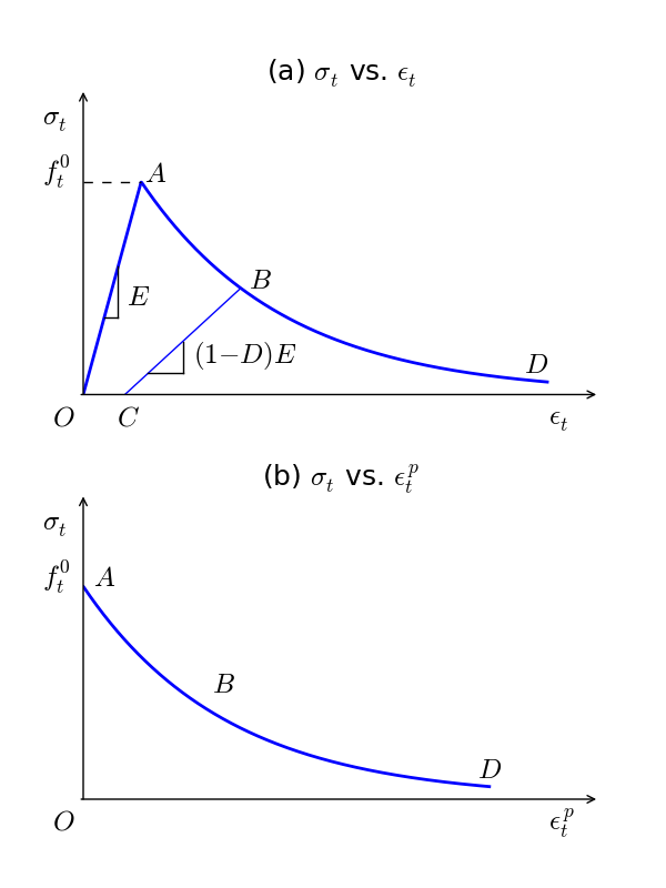 In this model, two damage variables, one for tensile damage and the other for compressive damage, are defined independently, and each variable is factorized into the effective-stress response and stiffness degradation response parts. Considering a uniaxial tensile or compressive stress state, the state variable \(\chi \in [c,t]\) is introduced. The state is uniaxial tensile for \(\chi = t\) and uniaxial compressive for \(\chi = c\).
