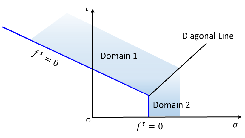 in the \((\tau, \sigma)\) plane (see Figure Figure #modeldrucker-2), divides the domain of the elastic guess violating the composite yield function into two, domain 1 (shear failure) and domain 2 (tension failure), respectively