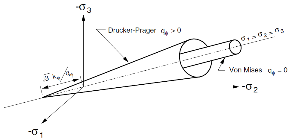 The parameters \(q_{\phi}\) and \(k_{\phi}\) can be adjusted so that the Drucker-Prager cone will pass through either the outer or the inner edges of the Mohr-Coulomb pyramid.