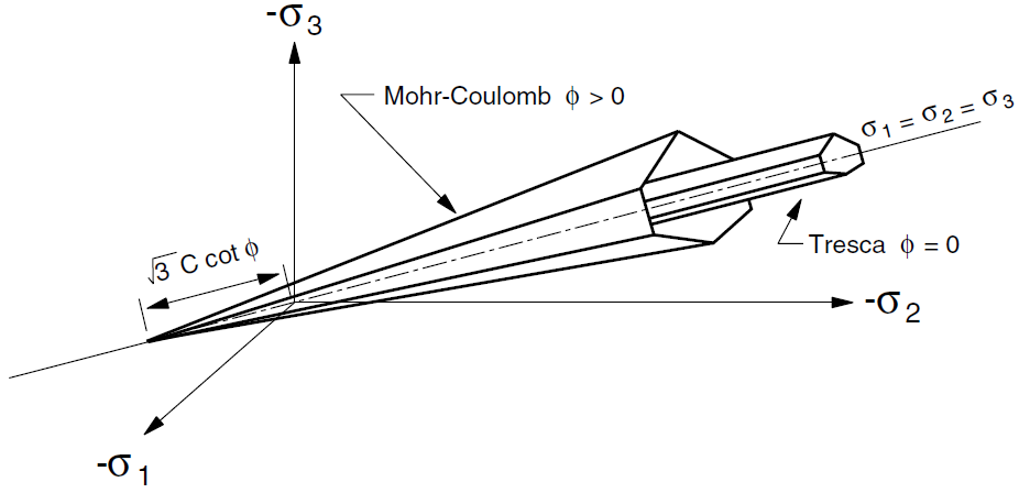 In the special case \(q_{\phi}\) = 0, the Drucker-Prager criterion degenerates into the von Mises criterion, which corresponds to a cylinder in the principal stress space. The Tresca criterion is a special case of the Mohr-Coulomb criterion for which \(\phi\) = 0. It is represented in the principal stress space by a regular hexagonal prism. The von Mises cylinder circumscribes the prism for
