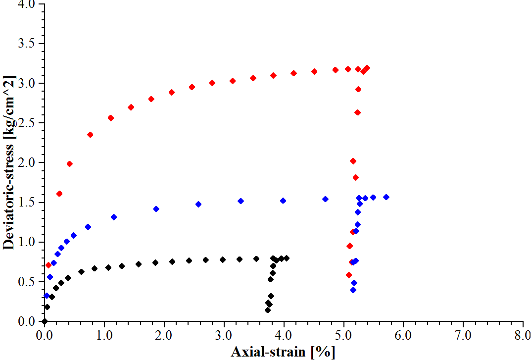 This section presents information on calibration techniques for the PH model material parameters using the conventional geotechnical laboratory tests. The calibration example uses original test results obtained from the triaxial compression tests on Monterey sand (Lade 1972). The triaxial test consisted of loading the specimen followed by the unloading-reloading regimes. The original test data are provided in Figure 3 and 4. The data are based on three sets of triaxial compression tests with confining pressures of 1.2, 0.6, and 0.3 kgf/cm2. The initial void ratios are 0.783, 0.786, and 0.781, respectively.