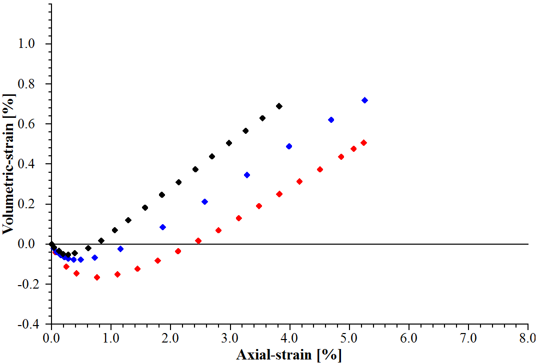Figure 4: Original \(\varepsilon_v\) vs. \(\varepsilon_1\) curves for confining pressures of 1.2, 0.6, and 0.3 kgf/cm2 of the triaxial compression tests of Monterey sand (Lade 1972).