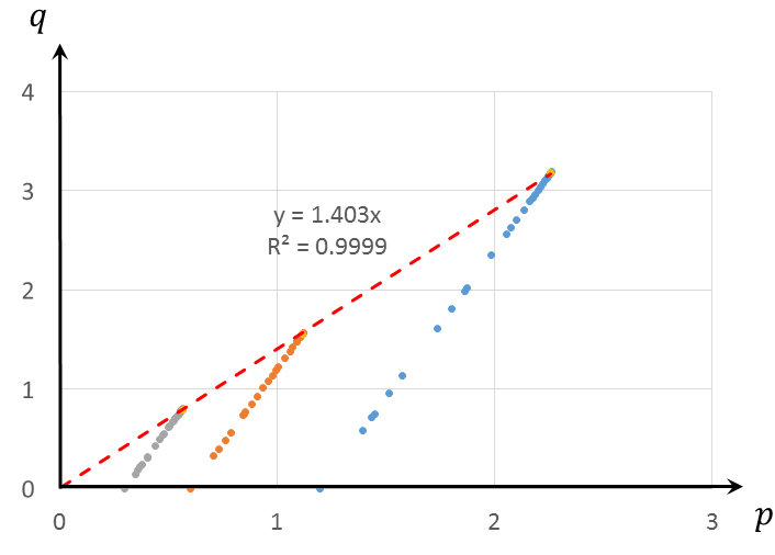 Plot deviatoric stress \(q\) vs. \(p\) using triaxial compression test lab data.