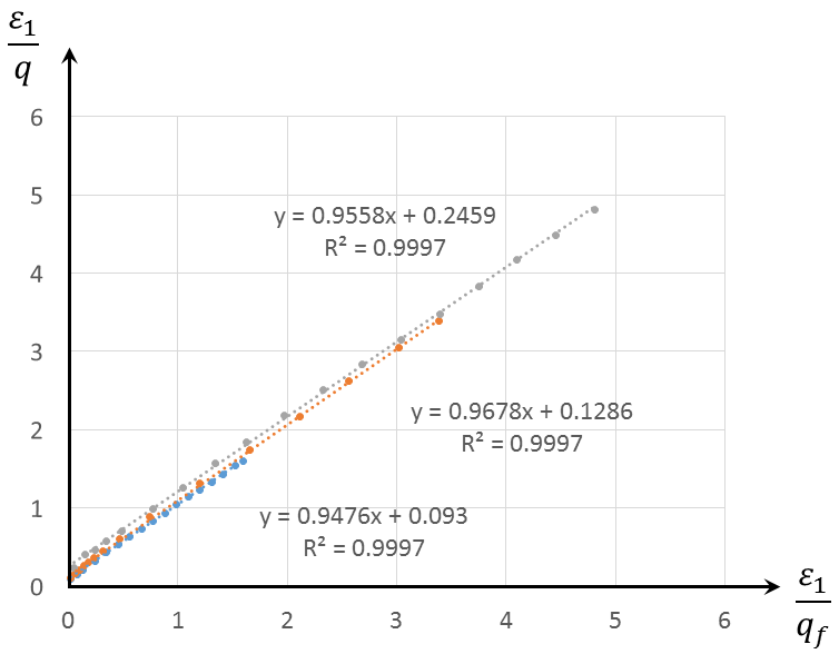 For a standard drained triaxial test, the connection between the axial (vertical compressional) strain, \(\varepsilon_1\), and deviatoric stress, \(q\), can be described by a hyperbolic relation: