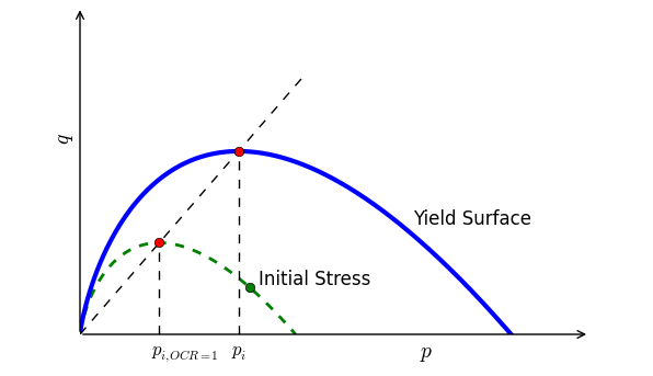 The NorSand model is a stress-dependent model. The initial conditions include the initial stress, \(\sigma_{ij,0}\), initial state, \(e_0\) or \(\psi_0\), and over-consolidation ratio, OCR. OCR in this model (Figure 2) is defined as the ratio of the current \(p_i\) over the calculated \(p_{i, OCR=1}\) so that the initial stress is on the yield surface assuming OCR = 1.