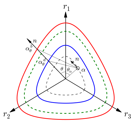 As described in the DM04 model, if one draws from origin a line parallel to \(\boldsymbol{n}\), the line will intersect the bounding and dilatancy surfaces at at image back-stress ratio tensors \(\boldsymbol{\alpha}^b_{\theta}\) and \(\boldsymbol{\alpha}^d_{\theta}\), respectively: