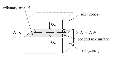 A geogrid is embedded in the interior of the model grid. The behavior at the geogrid-soil interface is summarized in Figures 1 to 2. The stresses acting on the geogrid are shown in Figure 1. These stresses, consisting of an effective confining stress, \(\sigma_m\), and a total shear stress, \(\tau\), are balanced by the membrane stresses that develop within the geogrid itself. These membrane stress resultants (see Stresses in Shells) are denoted by \(\bar N\) in Figure 1. The interface behavior is represented numerically at each geogrid node by a rigid attachment in the normal direction and a spring-slider in the tangent plane to the geogrid surface. The orientation of the spring-slider changes in response to relative shear displacement \({\bf u}_s\) between the geogrid and the host medium, as shown in Figure 2. The fact that there is only a single spring slider at each node makes the geogrid behave in a fashion similar to a coarse mesh of cross-linked bars. The spring-slider carries the total shear force acting over the tributary area on both sides of the geogrid surface. Also, the effective confining stress is assumed to be acting equally on both sides of the geogrid surface.