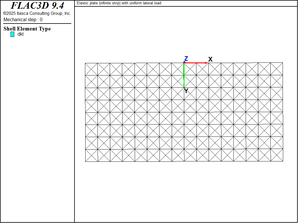 The infinite strip is modeled as a finite-sized rectangular plate of length \((a)\) and width \((b)\) using a 16 by 8 mesh of DKT elements with a cross-diagonal pattern as shown in Figure 2. The cross-diagonal pattern is used to ensure symmetric response. The simply-supported boundary condition (translational velocity fixed in the \(z\) direction) is assigned to the nodes along the \(y=0\) and \(y=b\) lines. Rigid-body motion is prevented by fixing the \(x\) and \(y\) translational of the upper-left node, and fixing the \(y\) translation of the lower-right node. The uniform lateral load is applied over the plate surface as a uniform pressure acting in the positive \(z\) direction. The \(z\)-displacement at the plate center is monitored as a history. Local nonviscous damping is used with a damping factor of 0.8. The model is run in small-strain mode to correspond with the small-strain assumption of the analytical solution. The model is cycled until a convergence limit of \(1 \times 10^{-3}\) is achieved. The model response is compared with the analytical solution along the \(x=0\) line, where the response of the finite-sized plate is like that of the infinite strip.