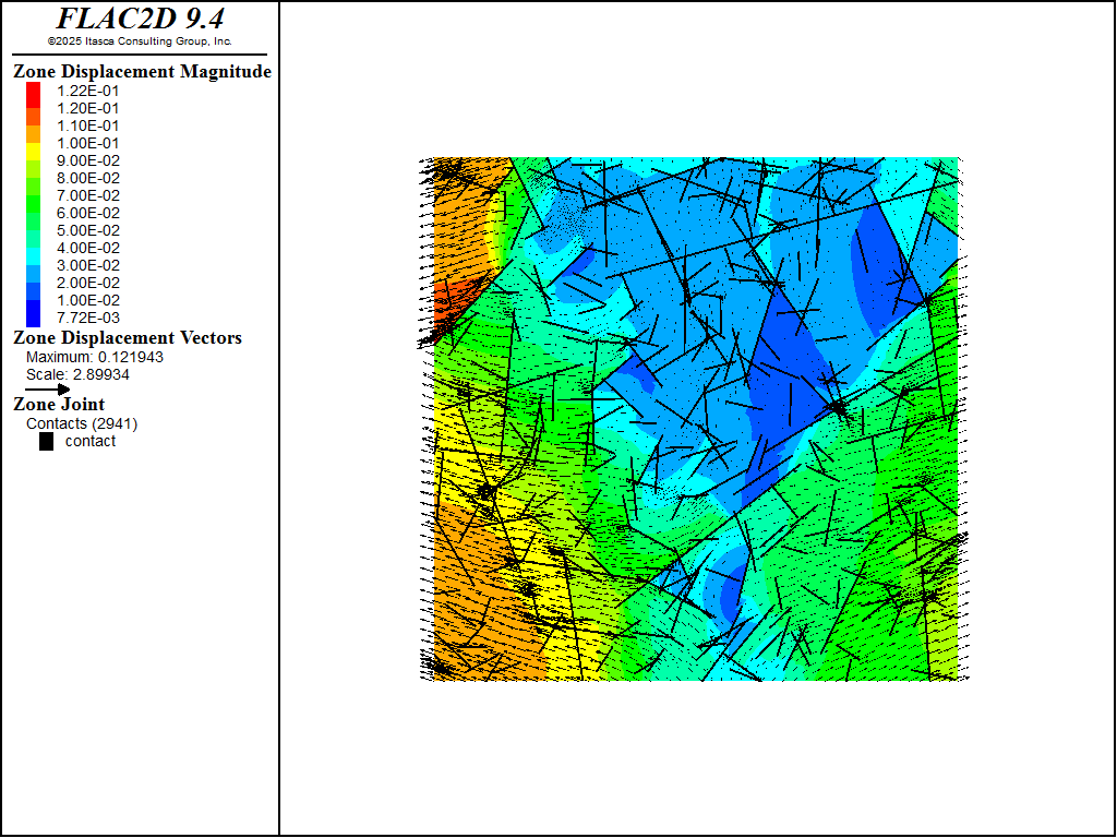 The stress-strain curve for this model is shown in Figure 5. The peak strength is approximately 4.7 MPa. Using equations here (Hoek-Brown Model), the unconfined strength for this Hoek-Brown material with no fractures is 18.8 MPa. Therefore, it is clear that the fractures are weakening the rock mass. In addition, the fractures cause the rock to behave in a ductile manner. The addition of many fractures causes the rock mass to behave more like a granular assembly than a competent rock.