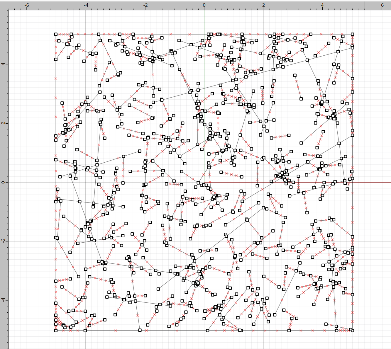 Click to see the fractures before generating. To actually create the nodes and edges in the workspace, click . The model should appear as shown below. Note that the Fracture edges are automatically assigned a group name “DFN-1” in slot “dfn”. This will be useful later when creating joints.