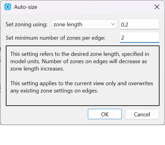 In the zoning menu, select Auto Size and set Zone Length to 0.2. Set the minimum number of zones per edge to 2. This is necessary to properly separate the faces when turning the Fracture edges into joints.