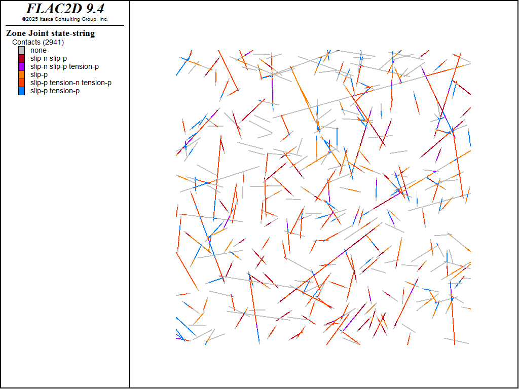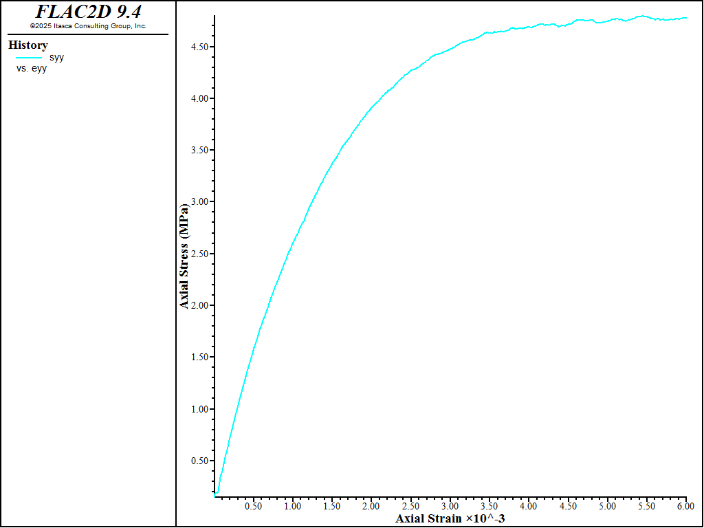 Specify rock and joint properties as in Table 1. Some FISH is now used to record the axial stress and strain as shown in ucs.dat. Finally, velocity boundary conditions are applied to the top and bottom of the sample to cause compression.